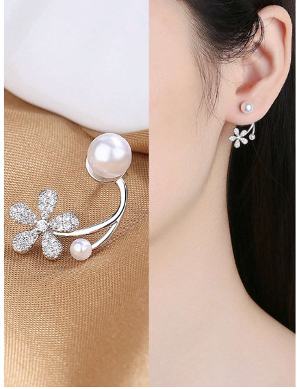 Korean Zircon Flower Pearl Front Back Earrings For Girls